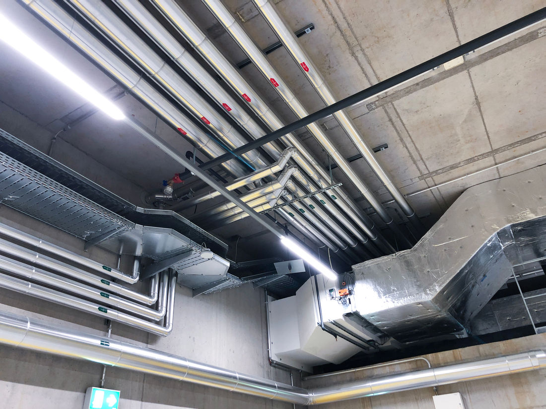 Die im Untergeschoss angeordneten Sanitärapparate liegen unter der Rückstauebene und werden über eine zentrale Schmutzwasserhebeanlage entwässert. Auch die ERZ Waschboxen sowie die Werkstatt befinden sich im Untergeschoss. Das anfallende Schmutzwasser durchläuft verschiedene Aufbereitungsstufen und wird der höherliegenden Kanalisation zugeführt.